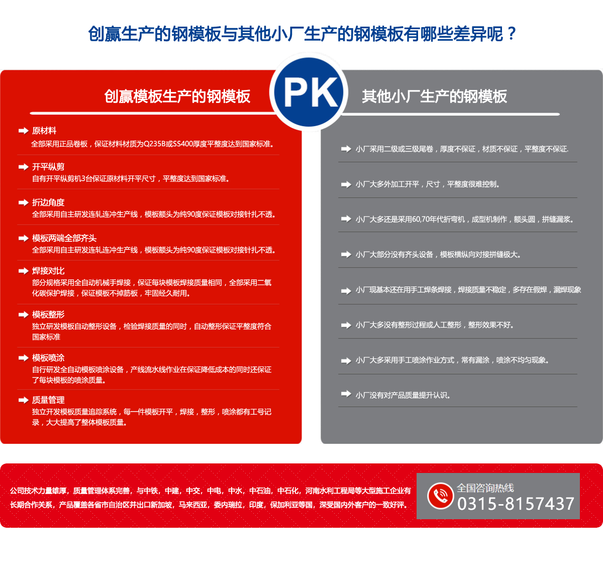 唐山創(chuàng)贏模板有限公司(原唐山豐南雙贏金屬結(jié)構(gòu)廠)始建于一九九七年,是具規(guī)模實力的組合模板生產(chǎn)企業(yè),公司自行設(shè)計制造的十二條上卷,連軋,連沖,整形,機械人焊接,調(diào)直,噴漆,打包鋼模板生產(chǎn),實現(xiàn)了自動化一條龍生產(chǎn),品質(zhì)優(yōu),效率高,規(guī)格型號為:寬度100-1200mm, 長度300-3000mm, 板厚1.8-4.0mm。 年產(chǎn)量可達200萬平方米,公司創(chuàng)新研制的輕型鋼框組合快拆鋼模板體系,是傳統(tǒng)組合小鋼模升級換代產(chǎn)品,可滿足房建,地下管廊,涵洞,公路,鐵路及各類施工企業(yè)的需要,輕型鋼框組合快拆鋼模板體系介紹及應(yīng)用,已在2017年《施工技術(shù)》雜志及《模板腳手架行業(yè)協(xié)會》雜志發(fā)表,詳情請查閱公司網(wǎng)站。 公司生產(chǎn)的噴漆鋼跳板,鍍鋅鋼跳板,采用連軋一次沖孔,承載力大,孔距均勻,外形美觀,年產(chǎn)量可達50萬塊,公司獨創(chuàng)的C型鋼生產(chǎn)線,以其產(chǎn)量高,強度大,成本低,交活迅速,在同行業(yè)占有較大優(yōu)勢,可與C型鋼廠家及各類施工企業(yè)合作共贏.